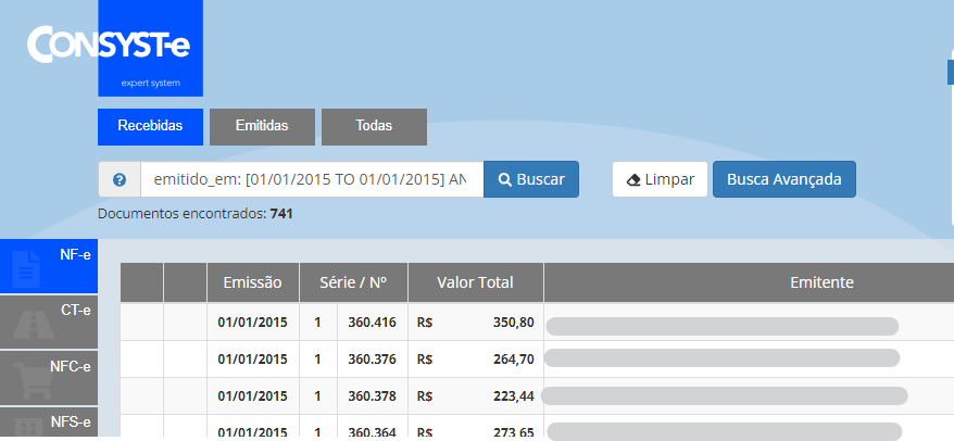 Em nosso exemplo, faremos uma busca de documentos emitidos apenas no dia 01/01/2015: